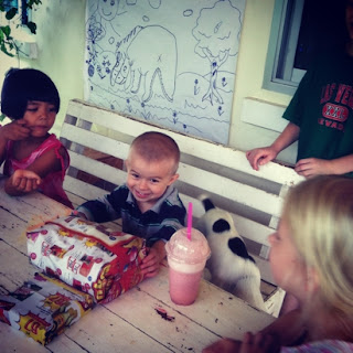 Today you walked to the little muban store down the street with your big brother, and no parents along, for the very first time. (The Boy had my cell phone in his pocket in case he should need any help but you didn’t know that.) You spent the few coins that he gave you with your birthday present on some candies and came home, very proudly, showing them to me. “Mommy, me back mommy. Me buy caneee!”